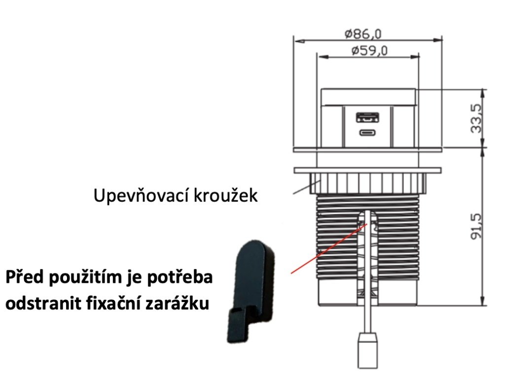 Instalace vyžaduje otvor o průměru 60 mm, je však možné použít pro otvor v rozmezí 60-80 mm (díky většímu límci a upevňovacímu kroužku). Nabíječka je vhodná pro stoly o maximální tloušťce 50 mm.