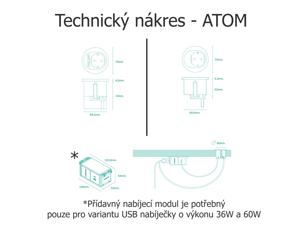 Zásuvka Atom je také dostupná s USB-C nabíječkou 60W - smartcharging. U tohoto typu je v balení také dokovací stanice, do které je potřeba zásuvku zapojit viz technický nákres v obrázcích.