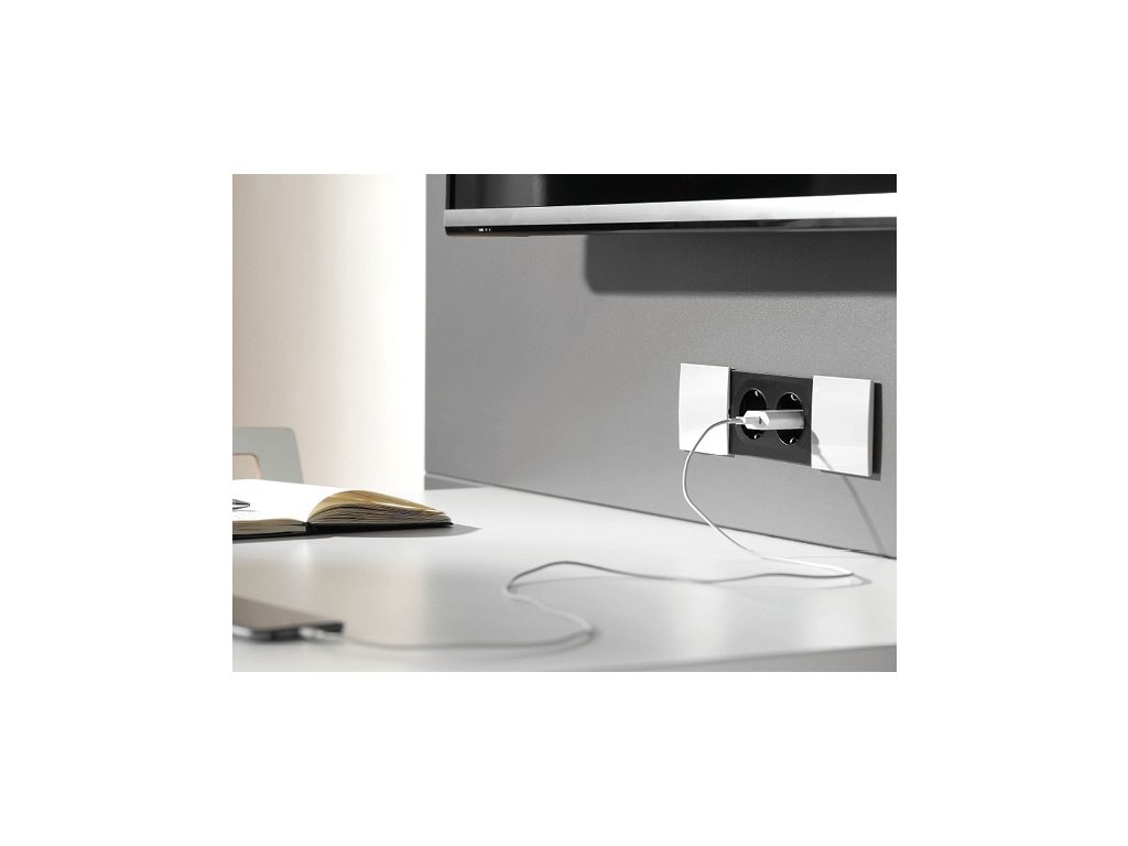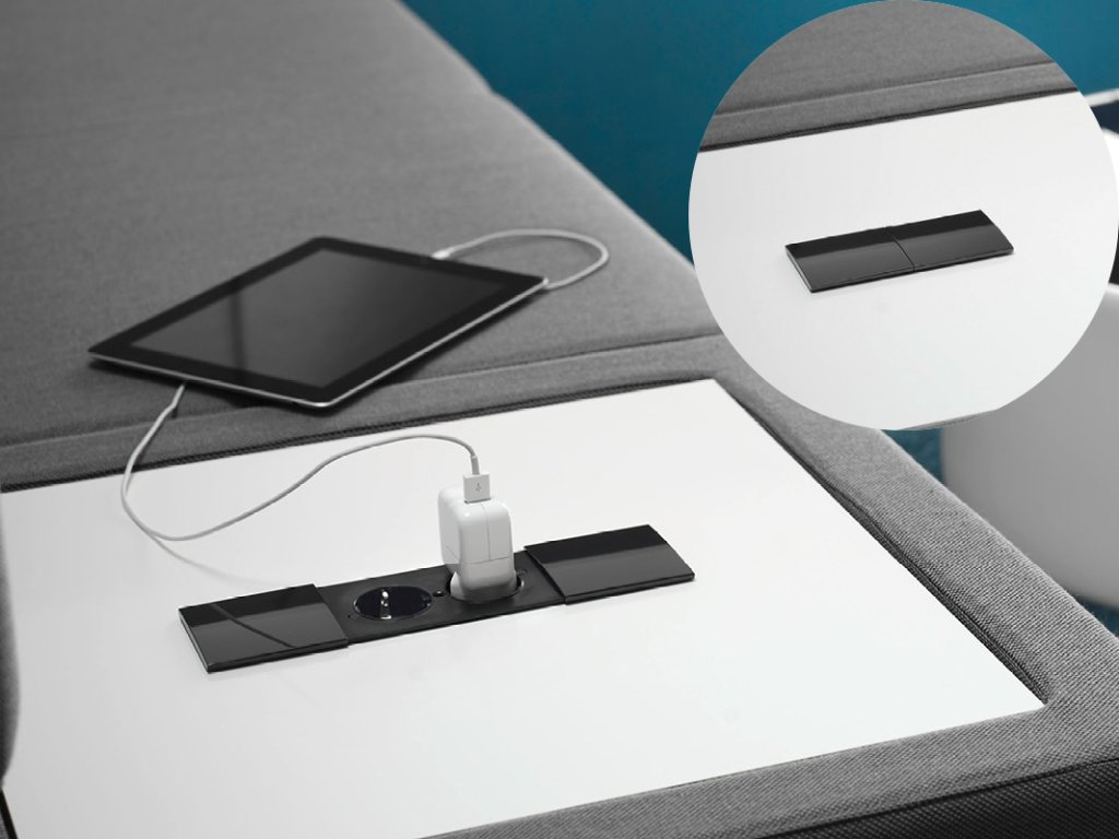 Při nepoužívání lze jednoduše posunutím krytek zakrýt. Zásuvka poté neruší design nábytku. Díky velmi malé instalační hloubce (45 mm) lze zásuvku namontovat i do nábytku nad šuplíky nebo do sádrokartonových zdí.