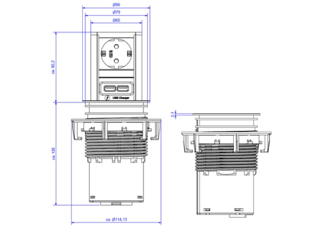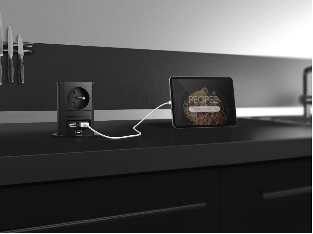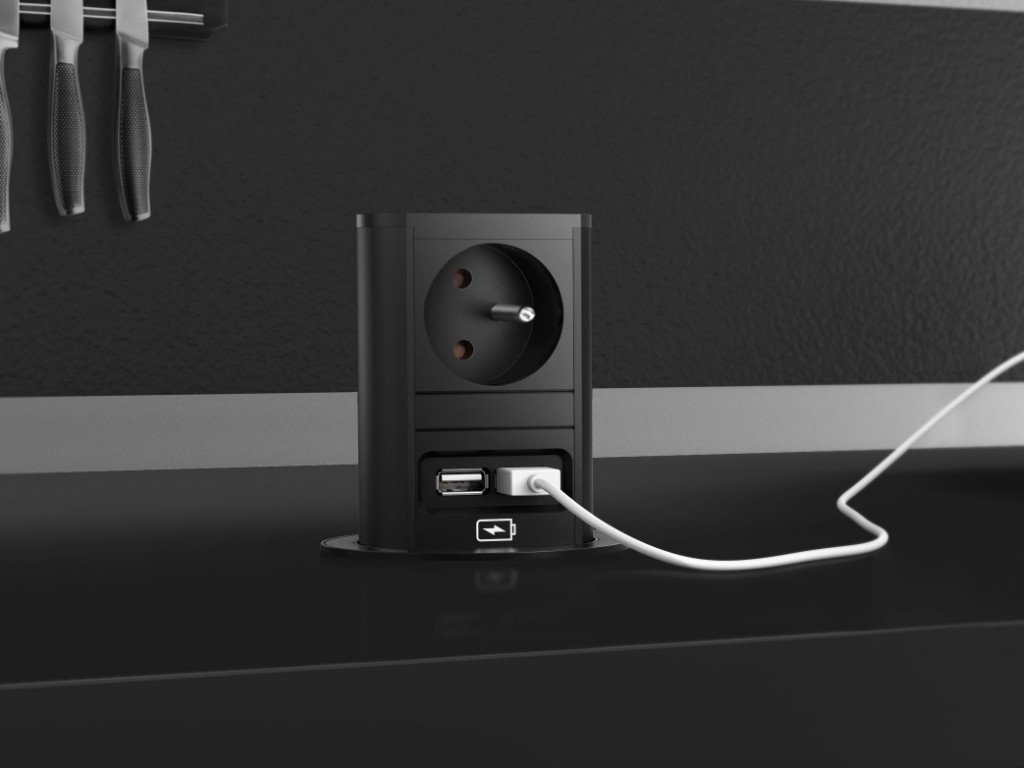 Sloupek je vybaven 1x 230V zásuvkou a USB nabíječkou se 2 porty USB „A“ (5V / 3,1A) a díky kompaktnímu designu neruší linie nábytku. Instalace je jednoduchá - do otvoru 80 mm vložíte zásuvku, ze spodní strany přišroubujete pojišťovacím kroužkem, zajistíte kabeláž a je hotovo.