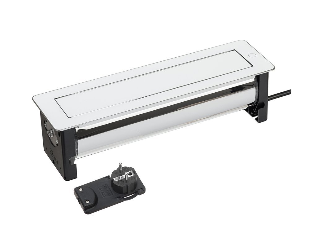 Zásuvka se lehkým stiskem dotykového tlačítka automaticky otevírá pomocí servomotoru, který zajišťuje tiché a plynulé otevření zásuvky pootočením o 180°. Opětovným stiskem tlačítka se zásuvka automaticky zavře. Zásuvka je vybavena bezpečnostním senzorem (laser), který zabrání nechtěnému zavření zásuvky (např. pokud je v zásuvce cokoliv zapojeno nebo na ni položeno).