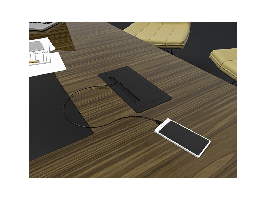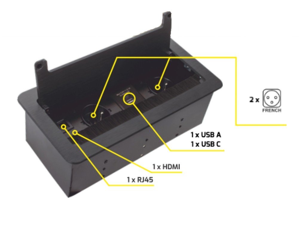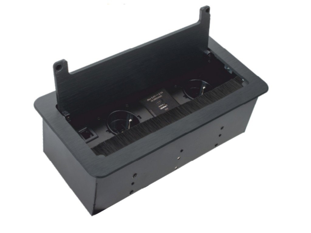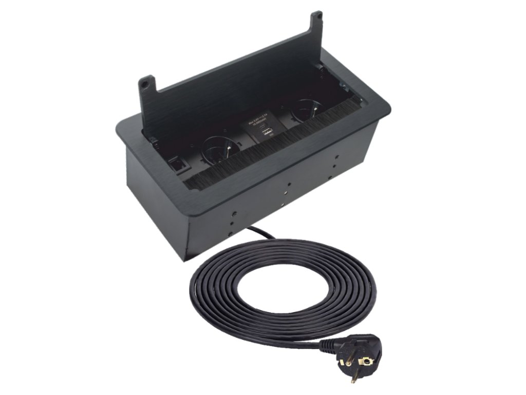 Výklopná vestavná zásuvka do pracovní desky s dodatečnou konektivitou v podobě datové zásuvky RJ45, spojky HDMI a USB nabíječkou s porty USB 1x „A“ a 1x „C" (5V - 2,1A s celkovým výkonem 10,5W). Kabely nejsou součásti dodávky.