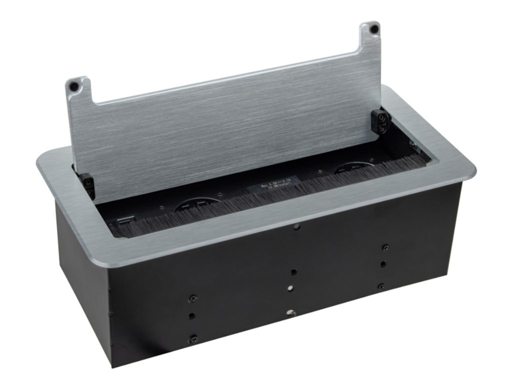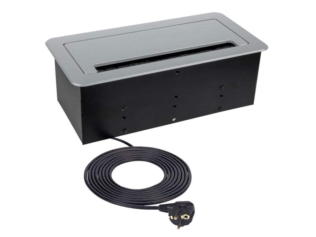 Víko zásuvky se otevírá i zavírá ručně. Zavírání je tlumené s tichým dovřením. Díky kartáčku v přední části lze zásuvku zavřít i s připojenými kabely.
