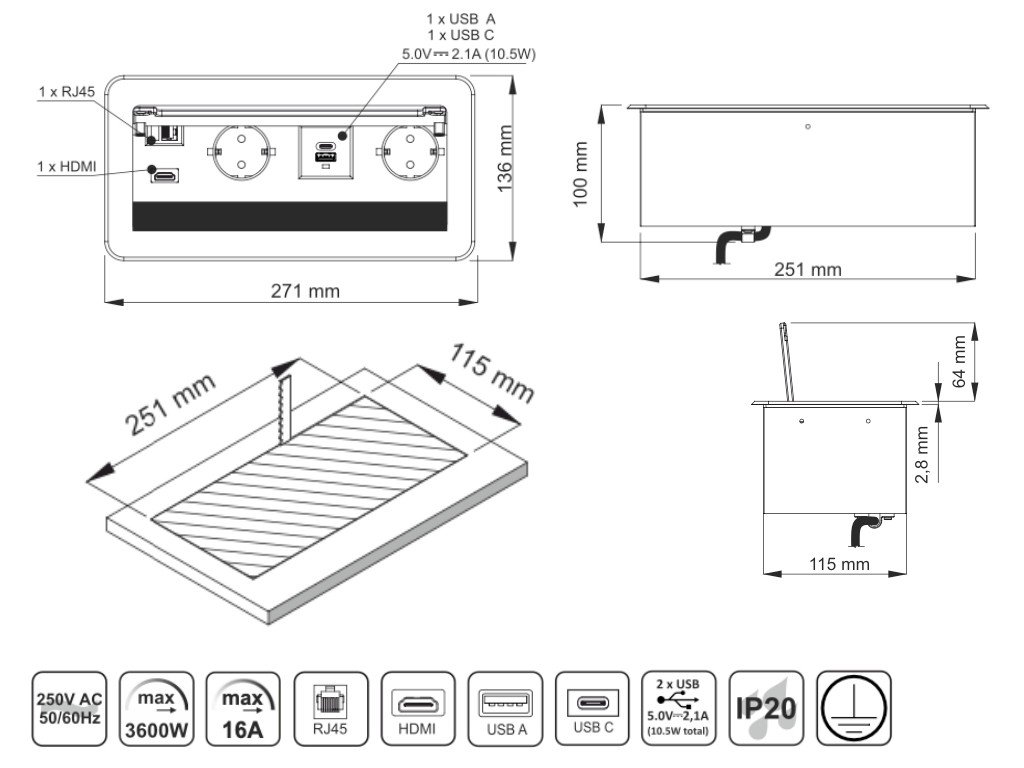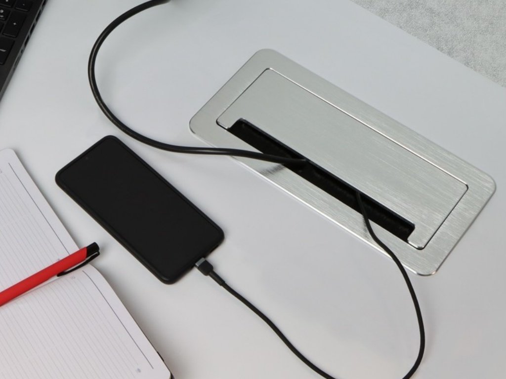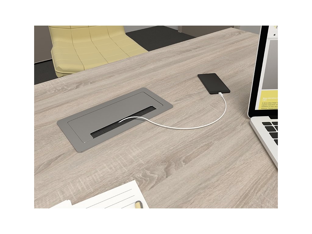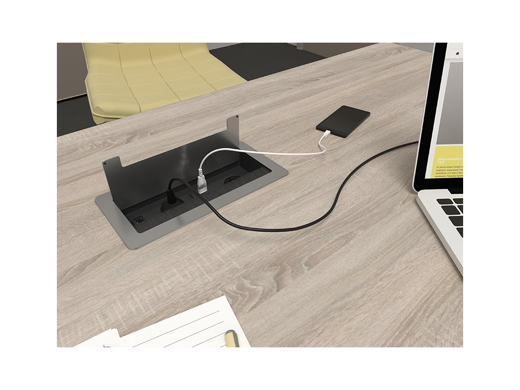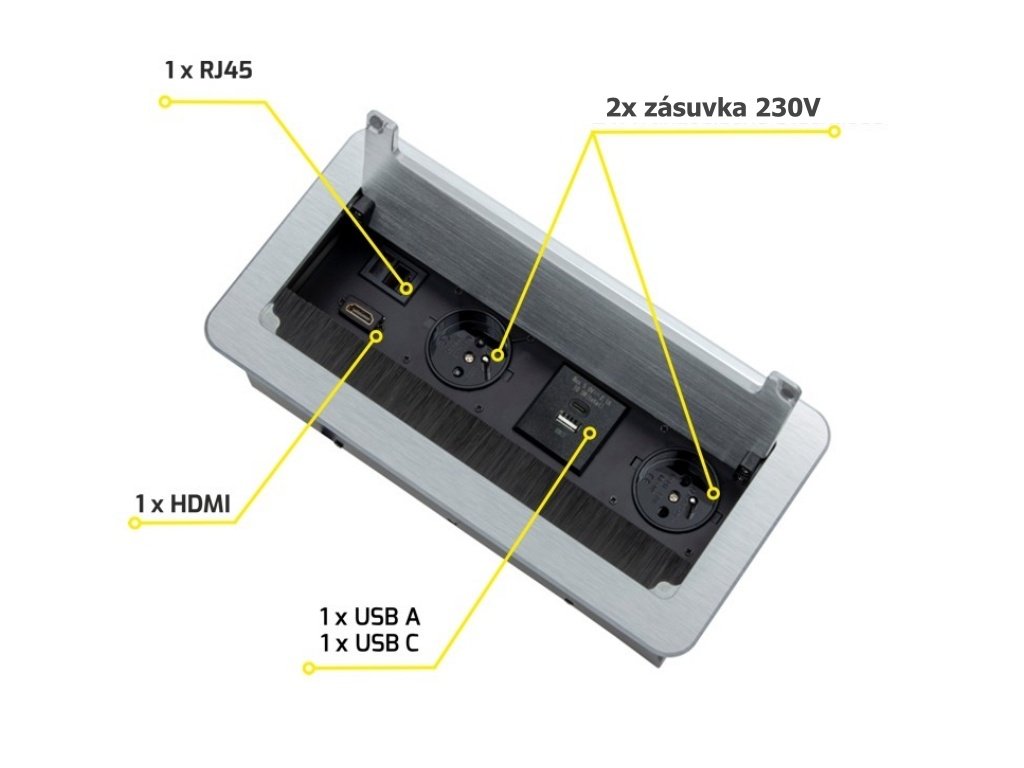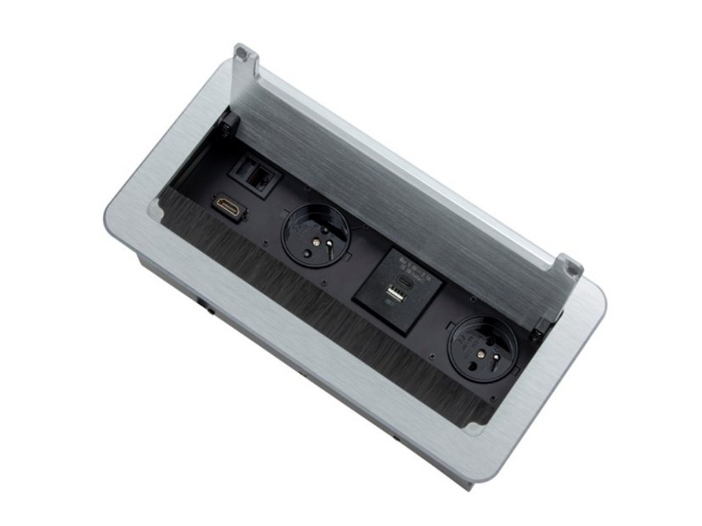 Výklopná vestavná zásuvka do pracovní desky s dodatečnou konektivitou v podobě datové zásuvky RJ45, spojky HDMI a USB nabíječkou s porty USB 1x „A“ a 1x „C" (5V - 2,1A s celkovým výkonem 10,5W). Kabely nejsou součásti dodávky.