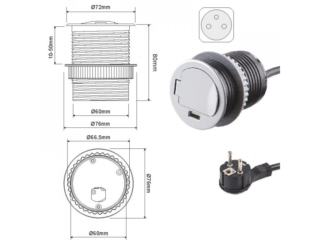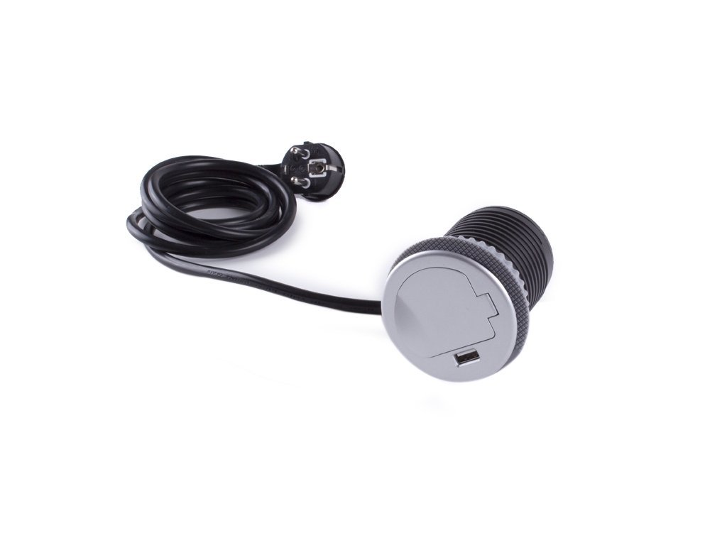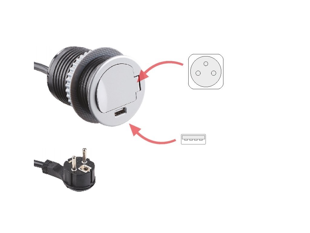 Zásuvka s jednoduchým designem a funkčnosti. Vestavná montáž do pracovního stolu nebo nábytku (např. obyvací stěna). Zásuvka 230V je zkryta pod krytkou a nabijecí port USB je stále přistupný.