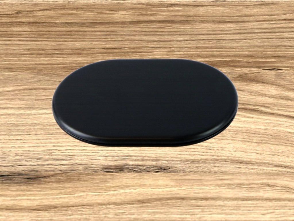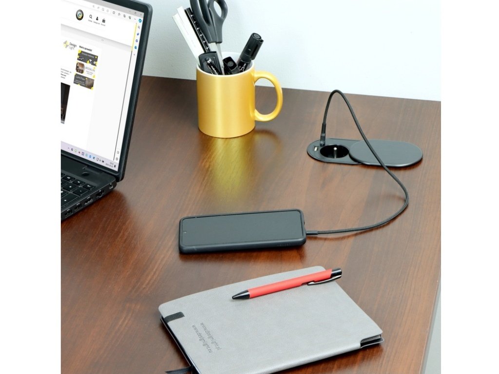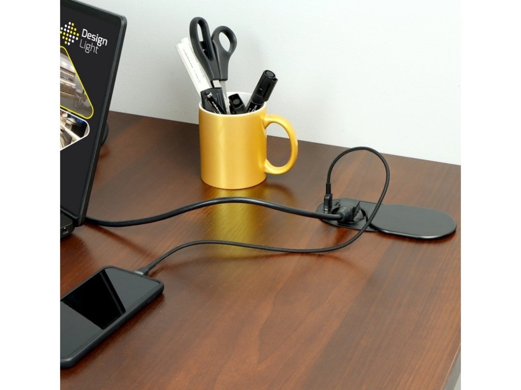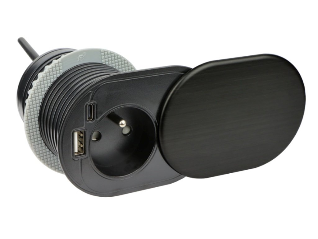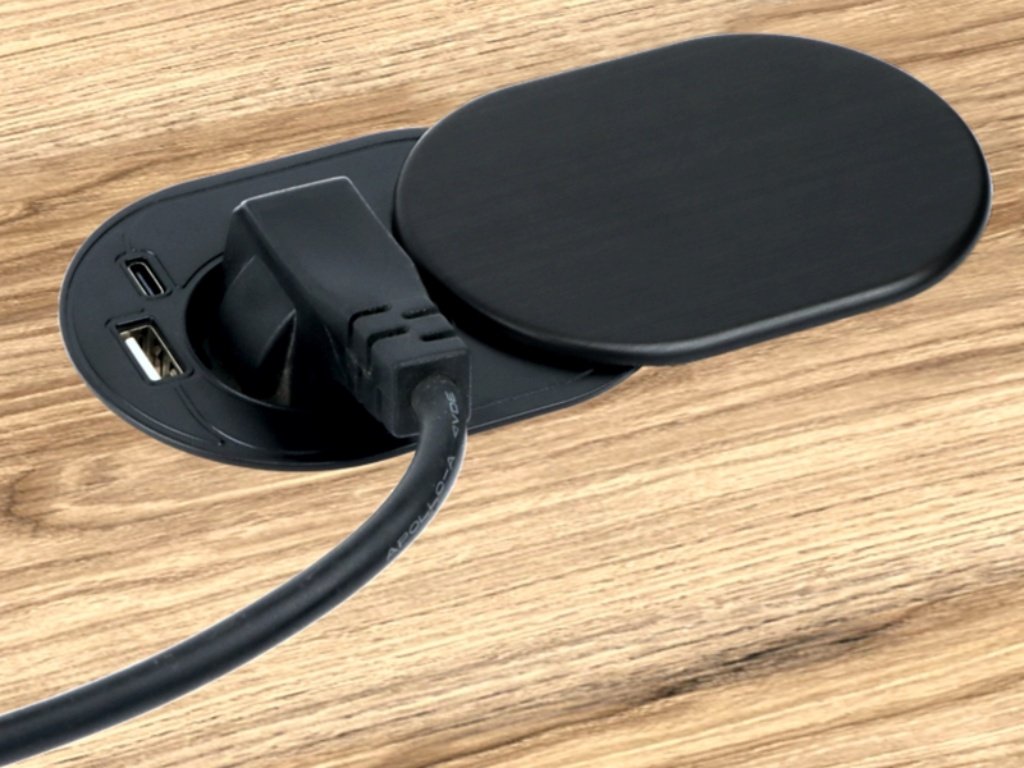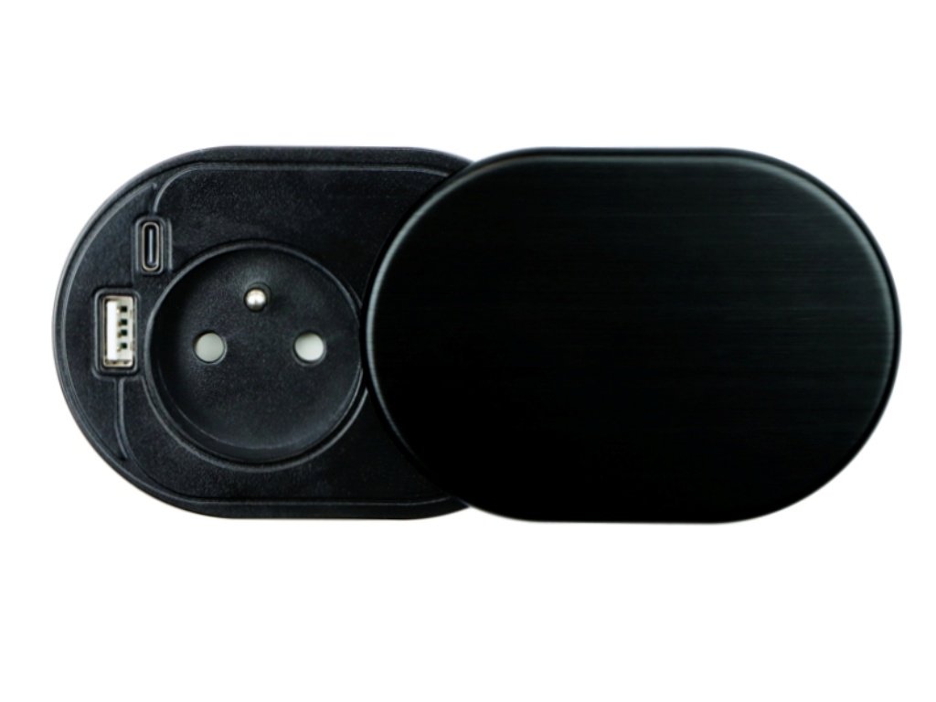 Zásuvka s moderním designem v moderní černé povrchové úpravě. Vestavná montáž do pracovního stolu nebo nábytku (např. obyvací stěna). Zásuvka a USB nabíječka je v zavřeném stavu zakryta pod posuvnou krytkou.