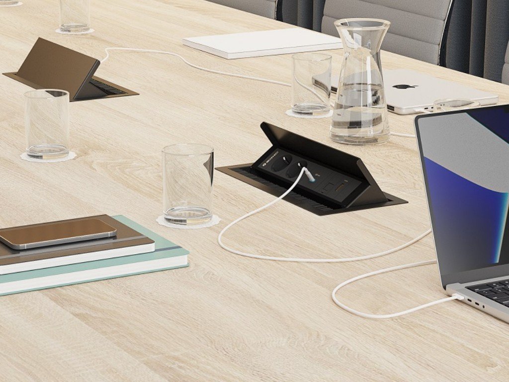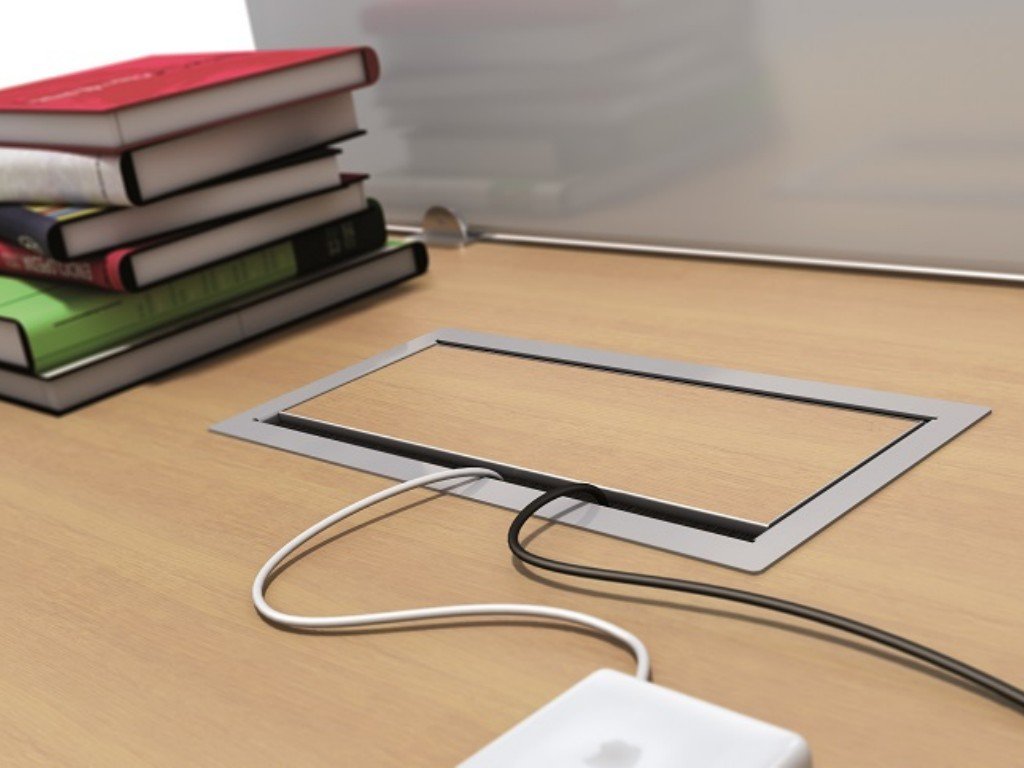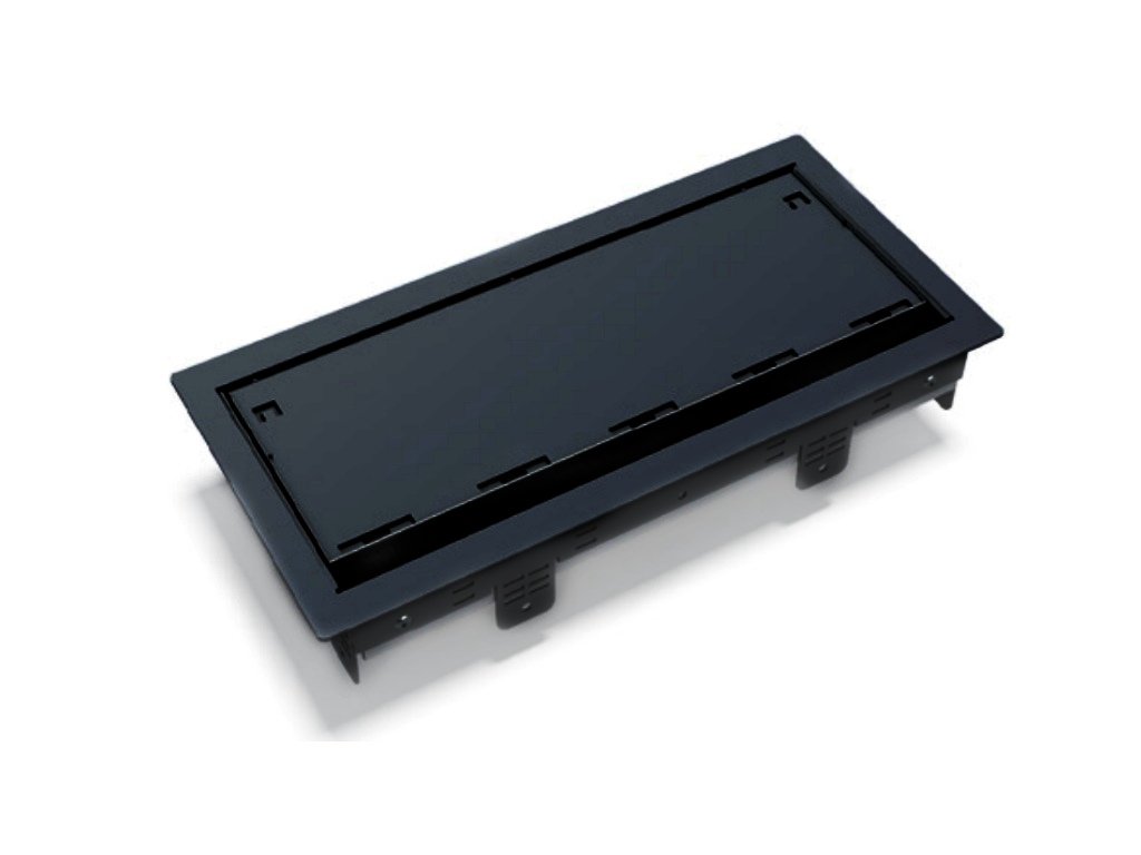 Robustní výklopný rám pro zabudování do desky stolu nebo nábytku. Jedná se o kovový rám v krásné černé matné povrchové úpravě s jemnou strukturou. Vrchní výklopná část lze individuálně upravit pomocí materiálu o tloušťce 1 mm (rozměr 282 x 101 mm), např. dýhou apod. Tím docílíte, aby velká část zásuvky měla stejný dekor jako váš stůl.