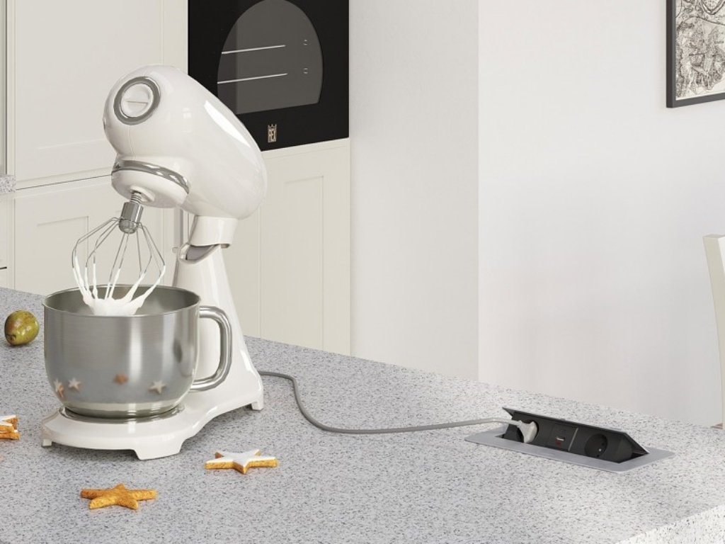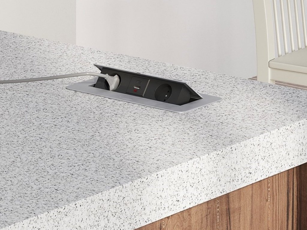 Zásuvka s moderním a ergonomickým designem pro instalaci do pracovního stolu nebo nábytku (např. obývací stěna, kuchyňský ostrůvek apod.). Otevření pomocí zmáčknutí tlačítka a zavření ručním zaklopením.