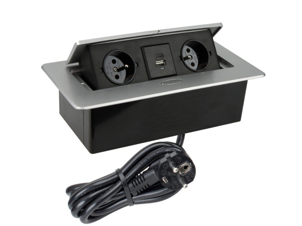 Výklopná zásuvka BOX 2x 230V a 2x USB nabíječka A+C s 3m kabelem - hliník