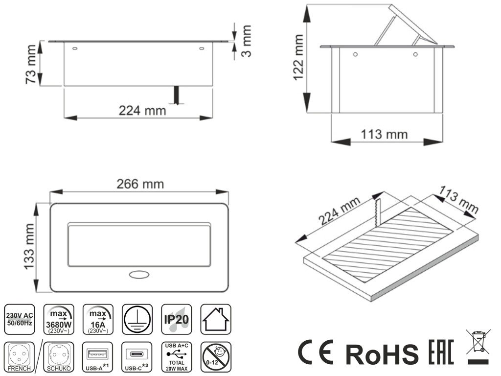 Zásuvka BOX je vybavena 2x zásuvkou 230V a USB nabíjecími porty 1x USB-C + 1x USB-A (max. 20W). Výklopný box je již osazen 3m napájecím kabelem pro připojení do síťové zásuvky.