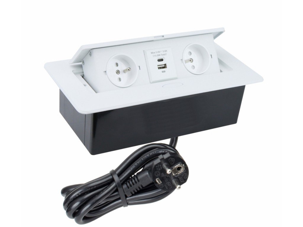 Výklopná vestavná zásuvka BOX 2x 230V a USB nabíječka A+C s připojeným 3m nap. kabelem - bílá