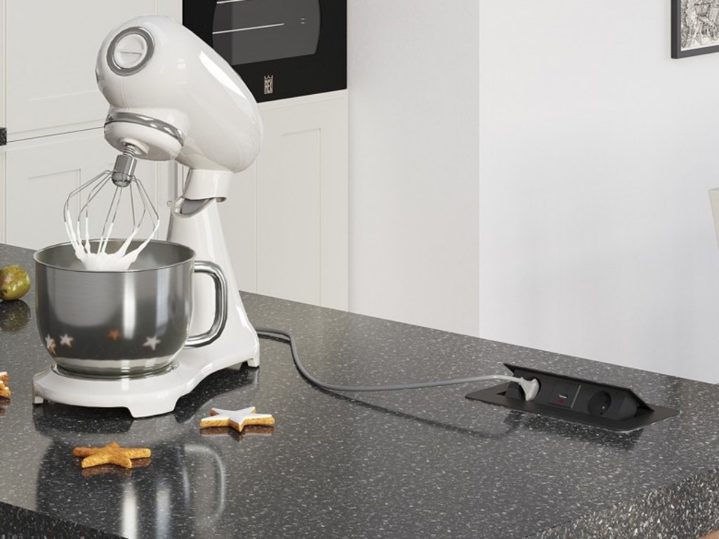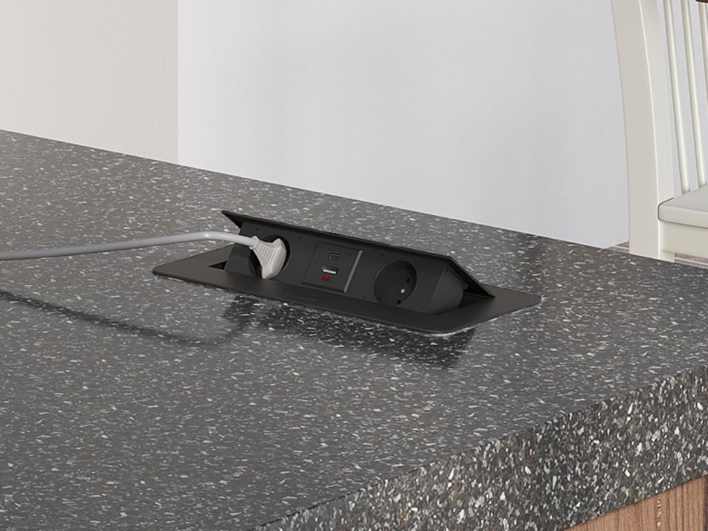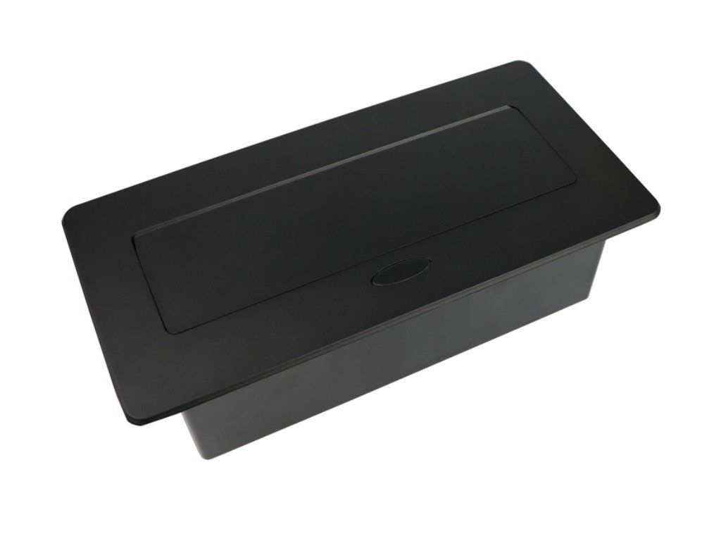 Zásuvka s moderním a ergonomickým designem pro instalaci do pracovního stolu nebo nábytku (např. obývací stěna, kuchyňský ostrůvek apod.). Otevření pomocí zmáčknutí tlačítka a zavření ručním zaklopením.