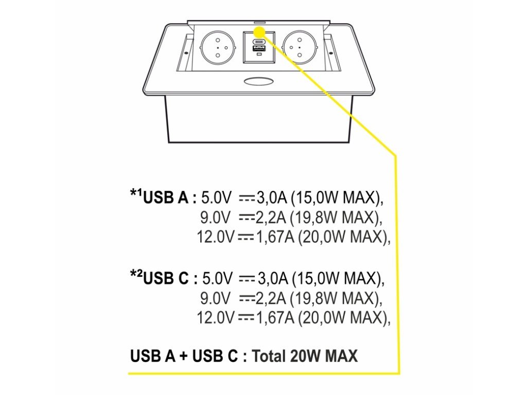 Zásuvka BOX je vybavena 2x zásuvkou 230V a USB nabíjecími porty 1x USB-C + 1x USB-A (max. 20W). Výklopný box je již osazen 3m napájecím kabelem pro připojení do síťové zásuvky.