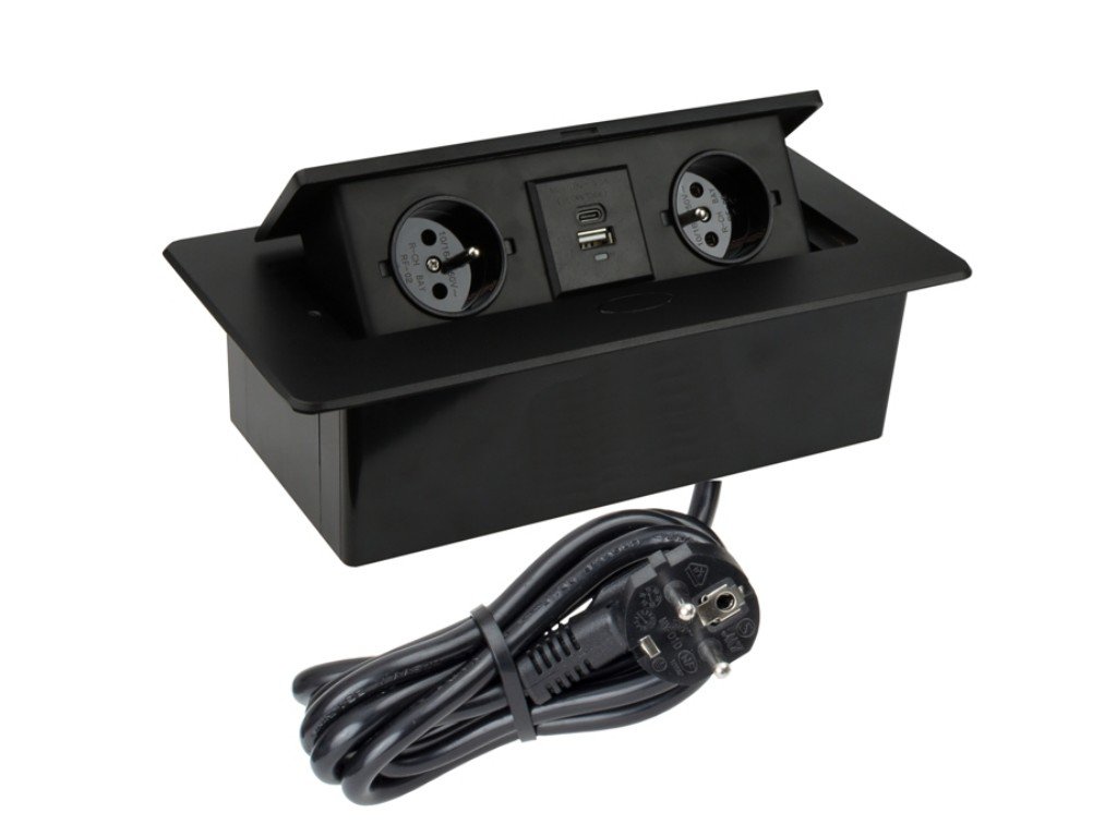 Výklopná vestavná zásuvka BOX 2x 230V a USB nabíječka A+C s připojeným 3m nap. kabelem - černá