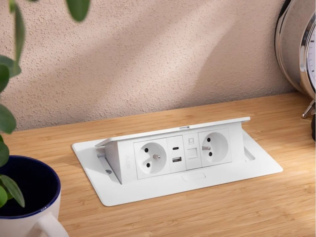 Zásuvka s moderním a ergonomickým designem pro instalaci do pracovního stolu nebo nábytku. Díky vybavení s HDMI a RJ45 se hodí také do open office stolů, kanceláří nebo domácí pracovny.
