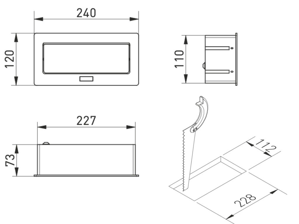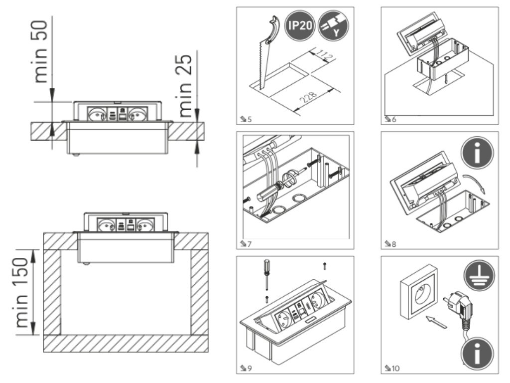 Montážní otvor pro zásuvku je 228 x 112 mm a vestavná hloubka 150 mm (včetně kabelu), viz také technický nákres v obrázcích.