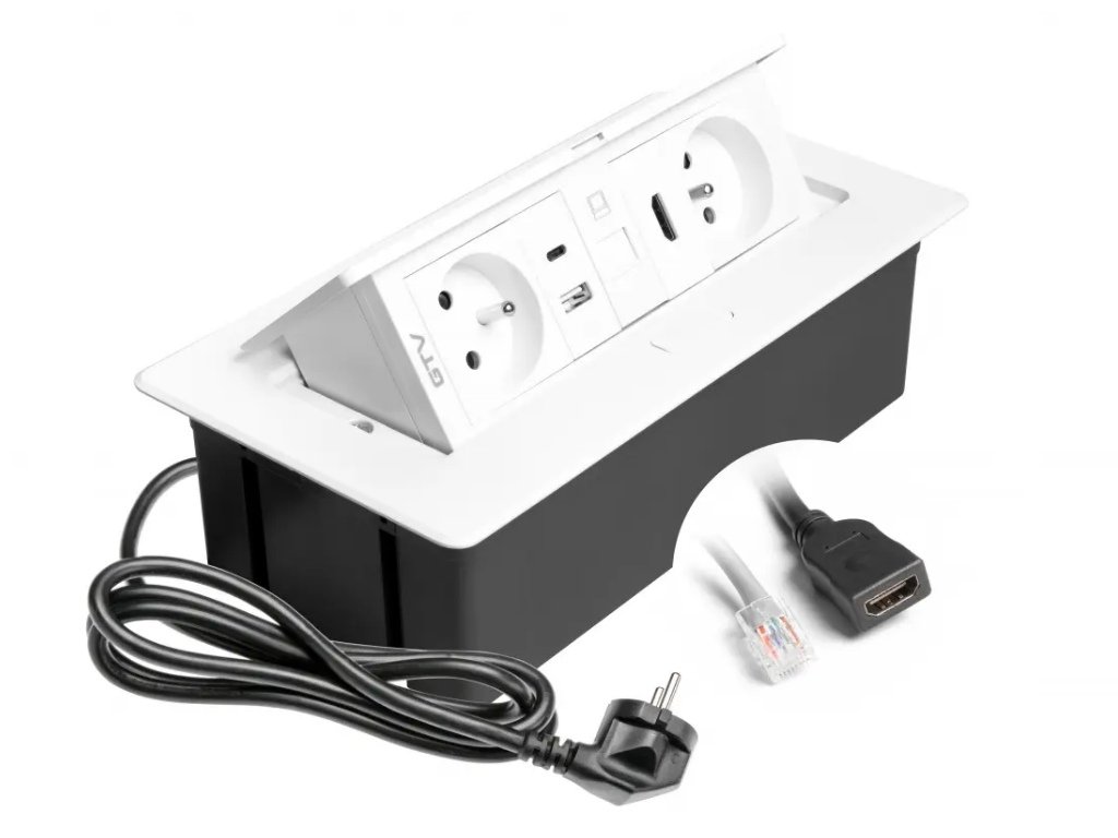Zásuvka MULTIBOX je vybavena 2x zásuvkou 230V, USB nabíjecími porty 1x USB-C + 1x USB-A, 1x datovou přípojkou RJ45 a 1x HDMI. Výklopný box je již osazen 1,5m napájecím kabelem pro připojení do síťové zásuvky.