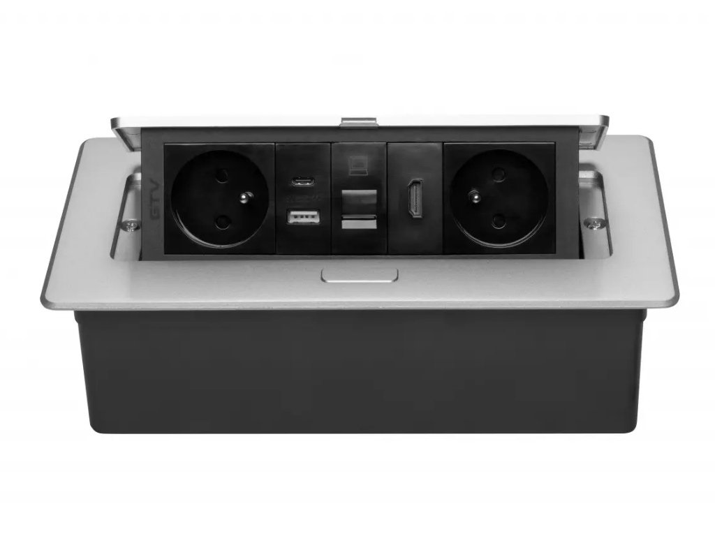 Výklopná zásuvka MULTIBOX 2x230V + USB nabíječka A/C + RJ45 a HDMI - hliník