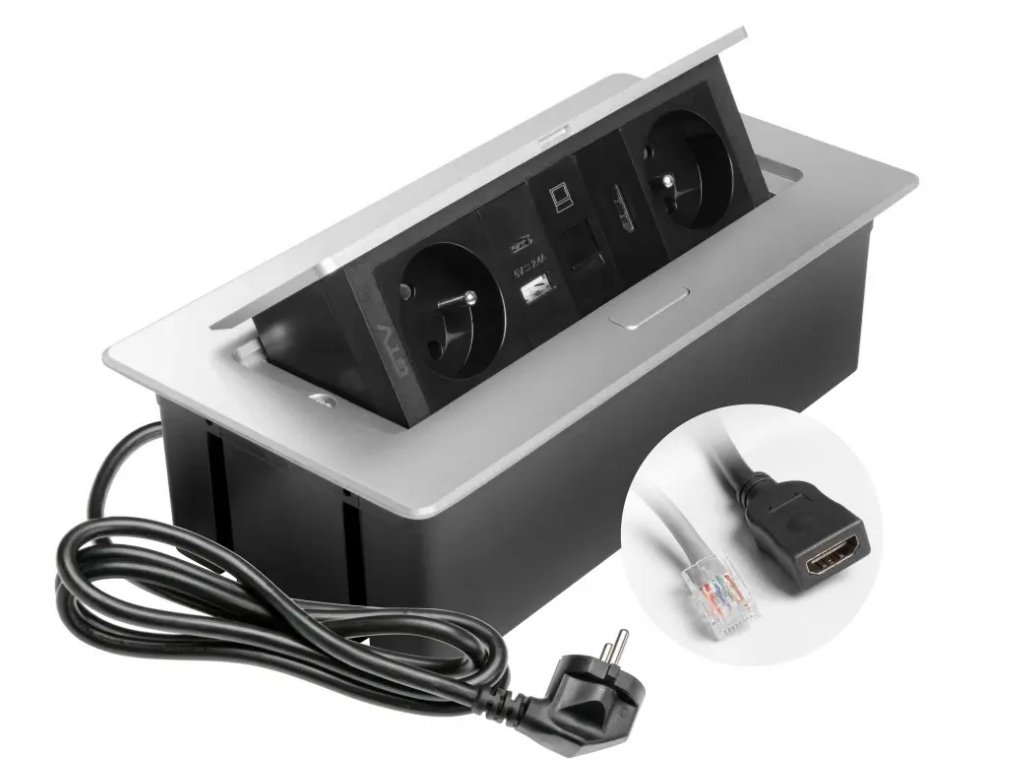 Zásuvka s moderním a ergonomickým designem pro instalaci do pracovního stolu nebo nábytku. Díky vybavení s HDMI a RJ45 se hodí také do open office stolů, kanceláří nebo domácí pracovny.
