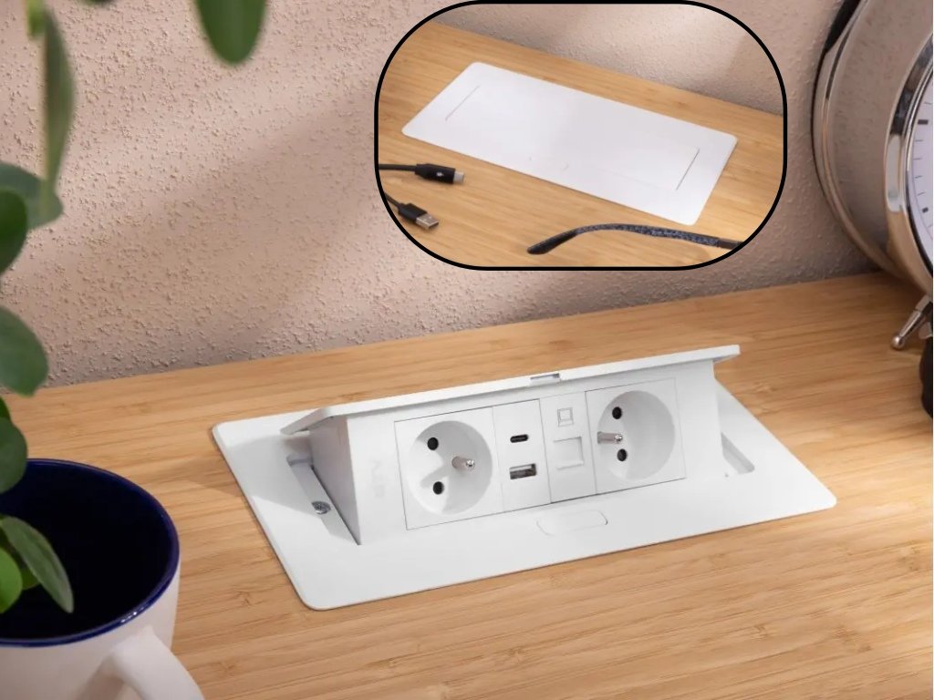 Zásuvka s moderním a ergonomickým designem pro instalaci do pracovního stolu nebo nábytku.