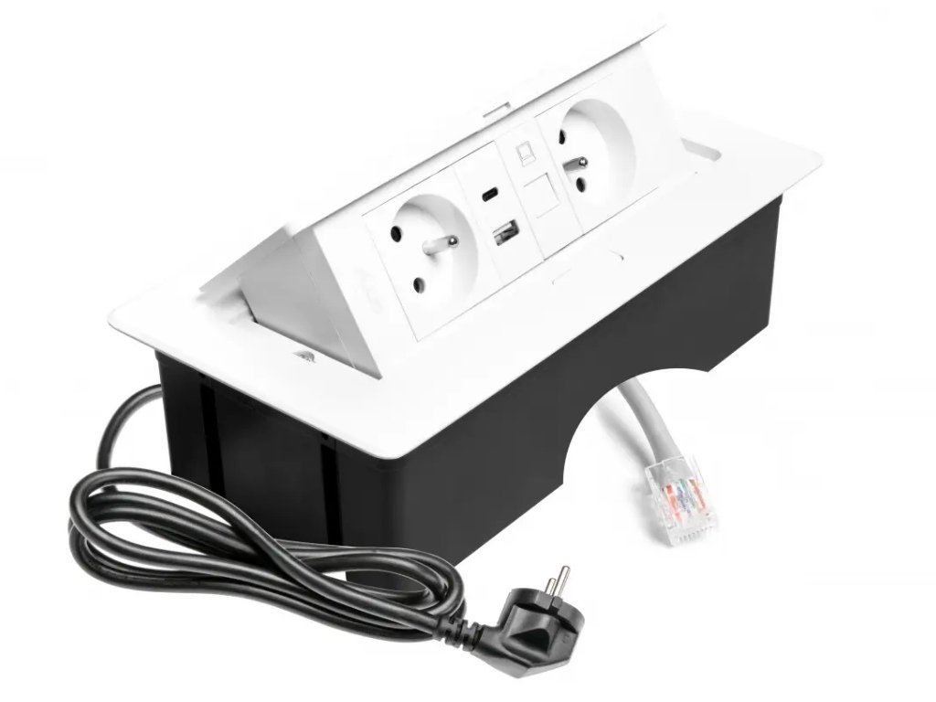 Zásuvka MULTIBOX je vybavena 2x zásuvkou 230V, USB nabíjecími porty 1x USB-C + 1x USB-A a 1x datovou přípojkou RJ45. Výklopný box je již osazen 1,5m napájecím kabelem pro připojení do síťové zásuvky.