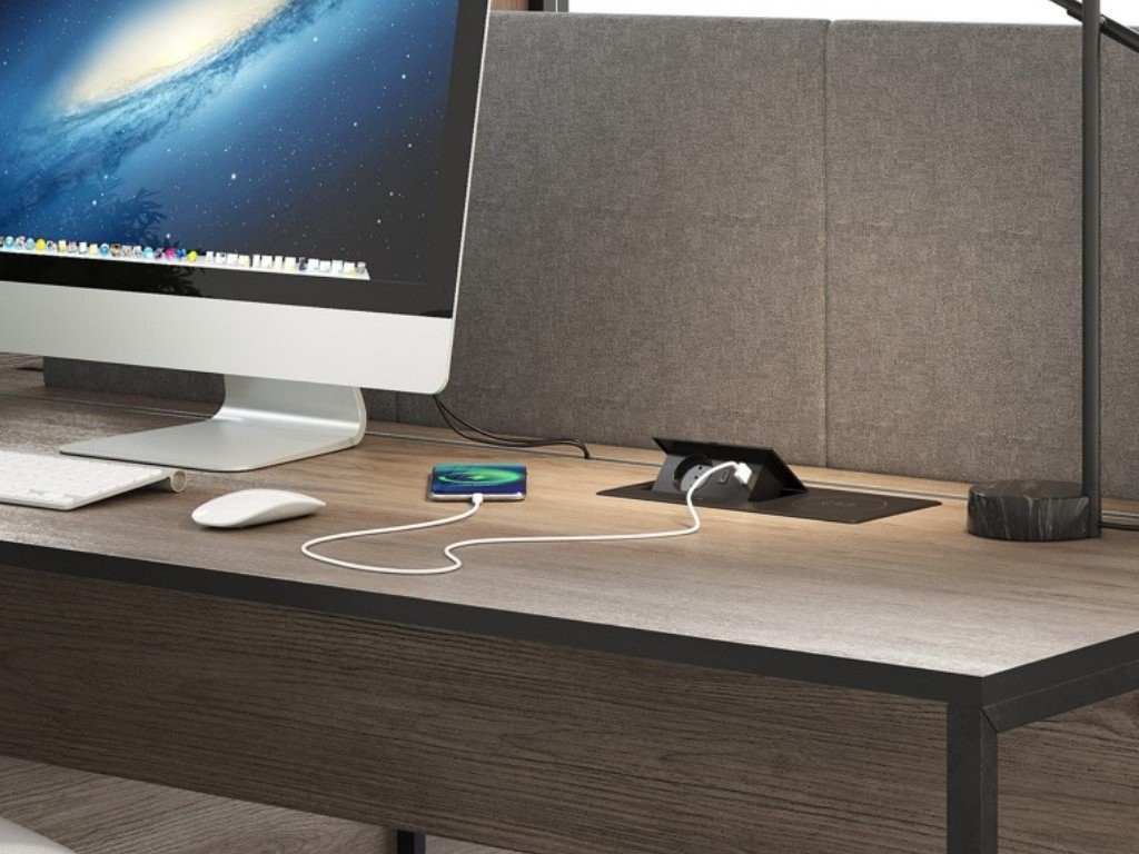 Zásuvka s moderním a ergonomickým designem pro instalaci do pracovního stolu nebo nábytku. Otevření pomocí zmáčknutí tlačítka a zavření ručním zaklopením.