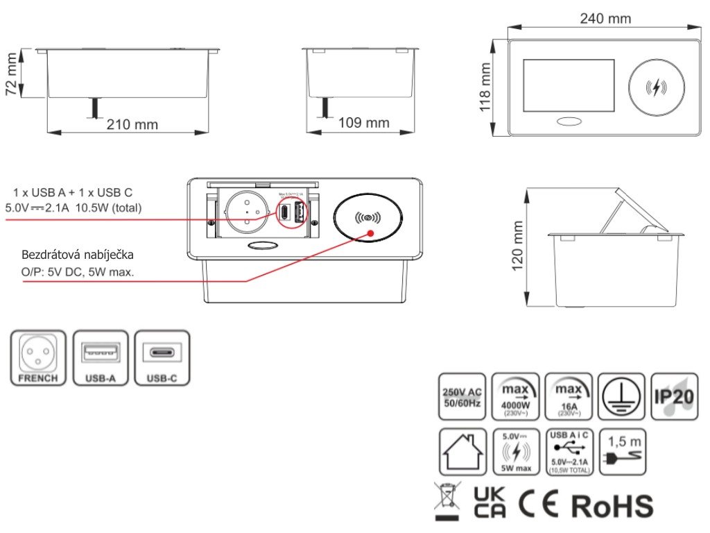 Zásuvka ZEBOX je vybavena ve výklopné části 1x zásuvkou 230V, USB nabíjecími porty 1x USB-C + 1x USB-A (5V / 2,1A) a vedle výklopné části je umístěna bezdrátová nabíječka (max. 5W). Výklopný box je již osazen 1,5m napájecím kabelem pro připojení do síťové zásuvky.