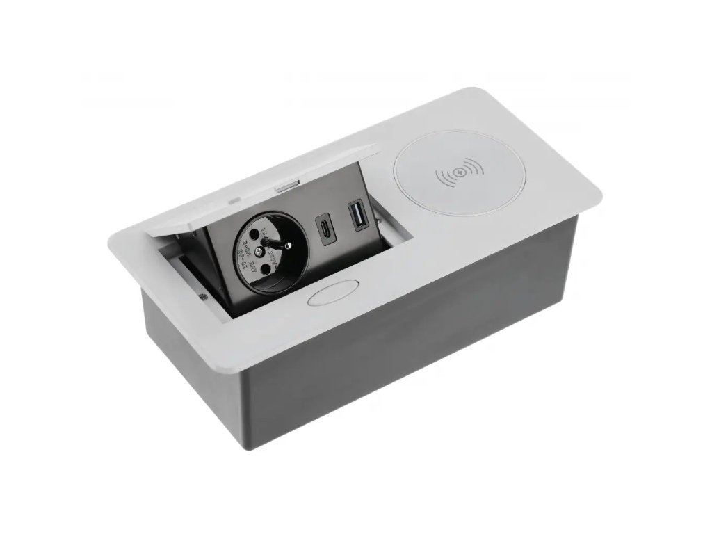 Zásuvka ZEBOX je vybavena ve výklopné části 1x zásuvkou 230V, USB nabíjecími porty 1x USB-C + 1x USB-A a vedle výklopné části je umístěna bezdrátová nabíječka (max. 5W). Výklopný box je již osazen 1,5m napájecím kabelem pro připojení do síťové zásuvky.