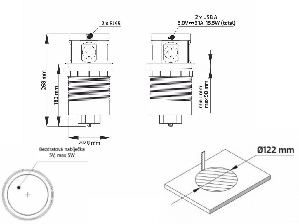 Vybavení el. zásuvky: | 230V, USB nabíječka „A", Datová spojka RJ45, USB nabíječka „C", Bezdrátové nabíjení |