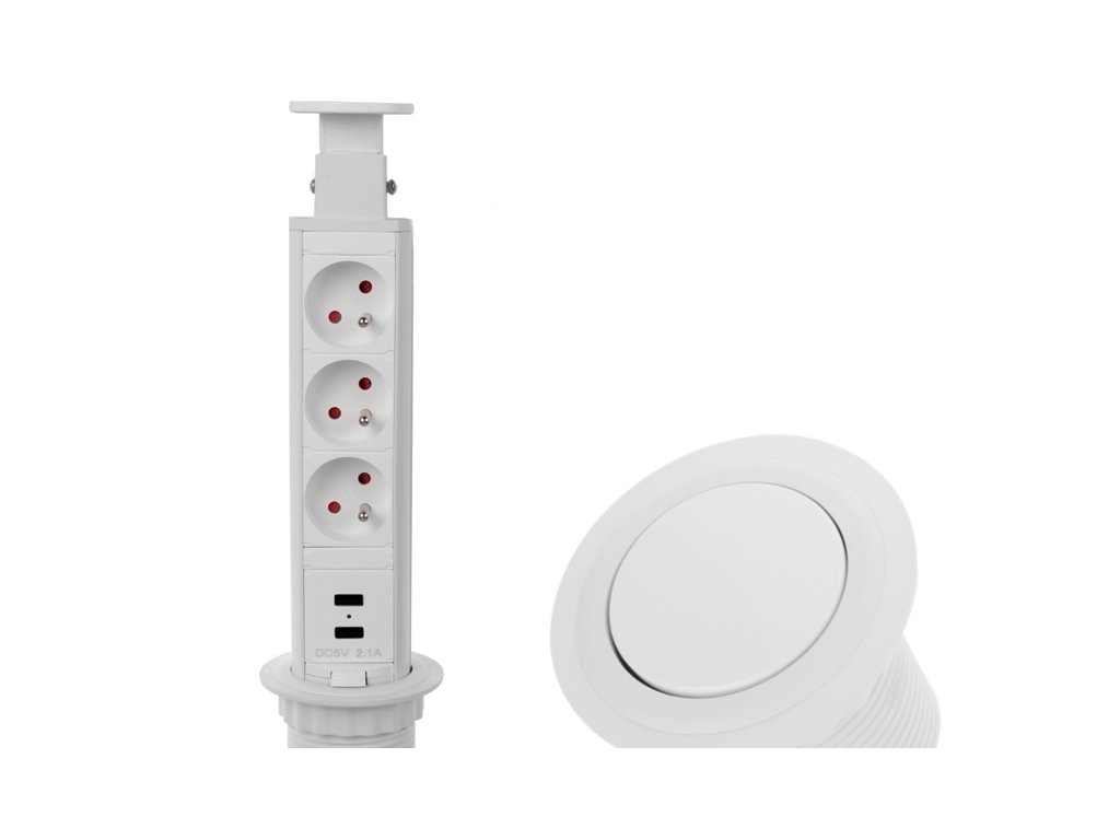 Po ručním vytažením zásuvkového sloupku odkryjete 3 elektrické zásuvky 230V a 2 USB nabíjecí konektory 5V / 2,1A. Zásuvka se nejčastěji montuje do kuchyňské linky.