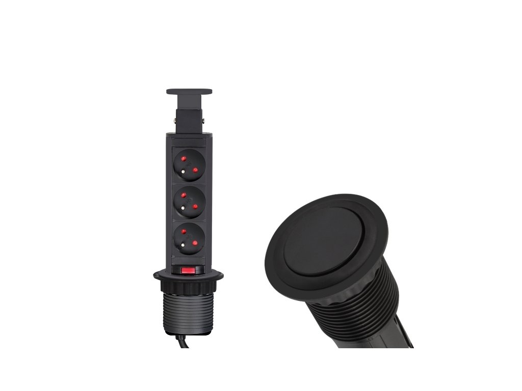 Po ručním vytažením zásuvkového sloupku odkryjete 3 elektrické zásuvky 230V. Zásuvka se nejčastěji montuje do kuchyňské linky.