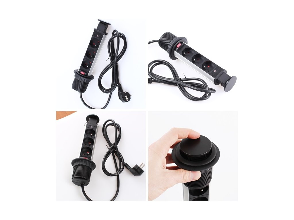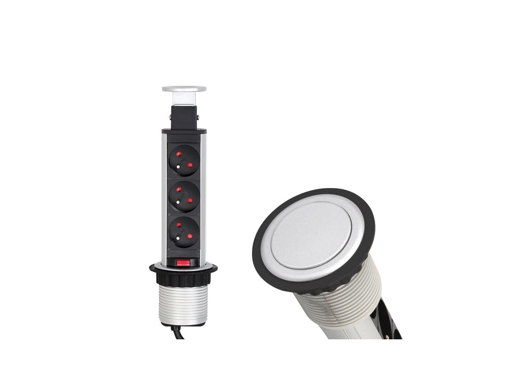 Po ručním vytažením zásuvkového sloupku odkryjete 3 elektrické zásuvky 230V. Zásuvka se nejčastěji montuje do kuchyňské linky.