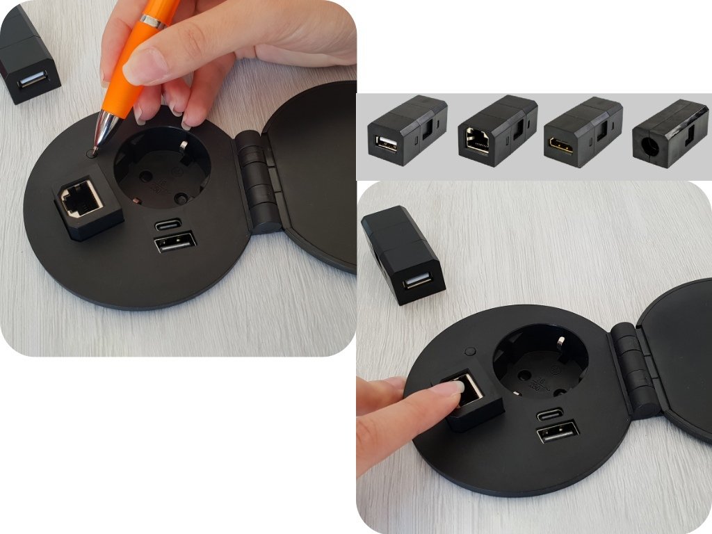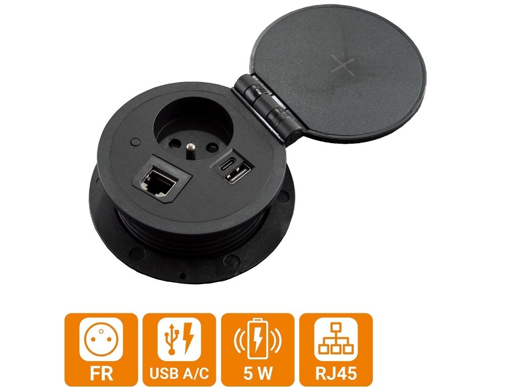Jednoduchá vestavná zásuvka, která je vybavena kromě 1x zásuvky také bezdrátovou nabíječkou (která je umístěna na vnitřní straně výklopné krytky a funguje tedy jen v otevřené poloze - max 5W), USB A+C nabíječkou (max 12 W) a modulem RJ45, který lze případně vyměnit za jiný modul. Výměnné moduly se zakupují zvlášť viz související položky. Modul RJ45 lze vyměnit za: