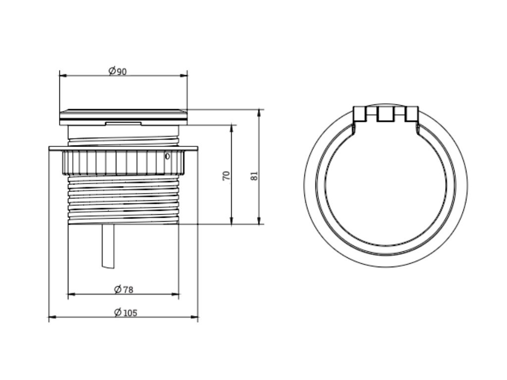 Zásuvka je vyrobena z tvrzeného plastu a montuje se do otvoru 80 mm. Technické informace naleznete v obrázcích.