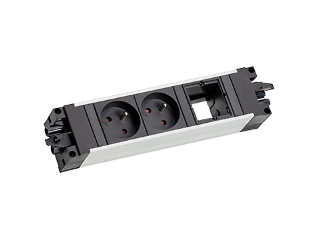 Zásuvka je osazena 2x zásuvkou 230V a 1x volným slotem pro konfiguraci.