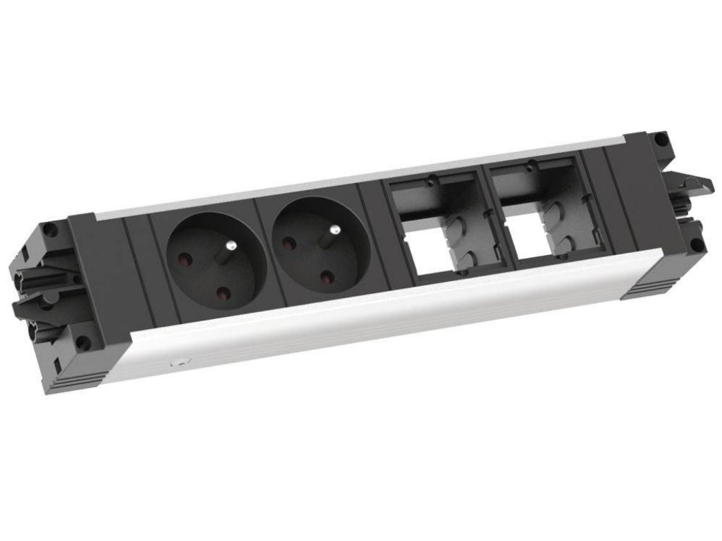 Zásuvka je osazena 2x zásuvkou 230V a 2x volným slotem pro konfiguraci.