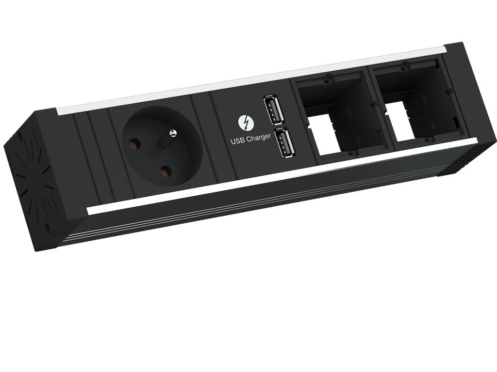 Zásuvková jednotka je vybavena 1 zásuvkou 230V, 2 volnými sloty a USB nabíječkou s 2 nabíjecími porty (5,2V / 3,15A). Volný slot je určen pro další konfiguraci dle vašeho požadavku (HDMI, USB, datová zásuvka RJ45 apod.). Nejpoužívanější moduly naleznete v souvisejících položkách.