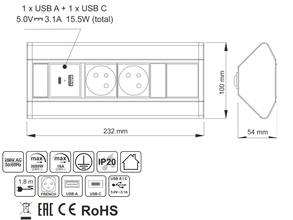 Zásuvka CORNER USB je vybavena 2x zásuvkou 230V a USB nabíječkou A+C (5V / 3,1A, max. 15,5W). Zásuvka CORNER je již osazena 1,8m napájecím kabelem pro připojení do síťové zásuvky.
