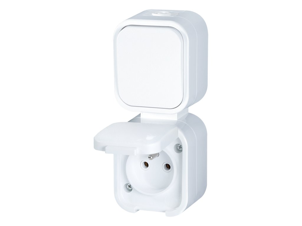 Zásuvka jednonásobná 2p+Z s víčkem + spínač IP54 bílá vertikální
